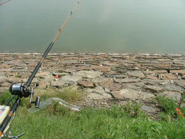 石堤は傾斜30度くらいでそのまま水中に落ち込み、五メートルほどの水深までの駆け上がりを形成している。その先はフラットな泥底。石積みの岸辺にはタニシがついている。すなわち、アオウオのポイントとしての好条件を満たしている。