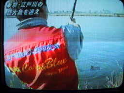 画面は切り替わります。 釣友浅岡君から携帯電話がはいり、アオをかけたとのこと。対岸の千葉県市川市・総武線下流までスタッフに急行してもらいます。 すでにヒットから20分程度ですが、 カメラが間に合いました。 |