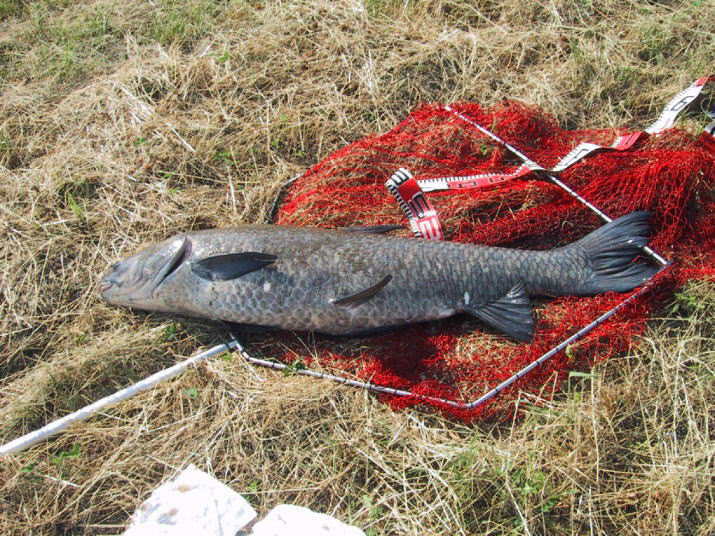 午前4時、ドシャ降りの最中に外道のコイに起こされビショ濡れとなるが、土曜昼には太陽も顔を見せ、正午に125cmが来た。(タモ入れ&撮影:井原清隆氏)