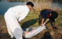 また、魚のエラは人間の肺にあたり、ロープを通すと必ず傷がつくので、 非常の場合以外は、遠慮されたい。やむをえずロープでつなぐ場合は、綿製のやわらかなものを使用する。