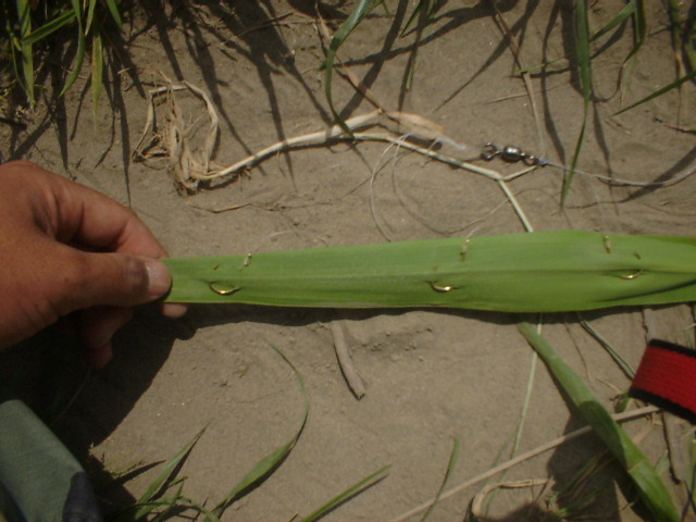 危険を覚悟で浅場に寄るソウギョは非常に警戒心が強いので、 Bアタリは、ほとんどの場合、静かに葉をくわえ、沖のほうへもっていく。竿先をよくみていると、 岸でかけたソウギョのダッシュは相当なもの。